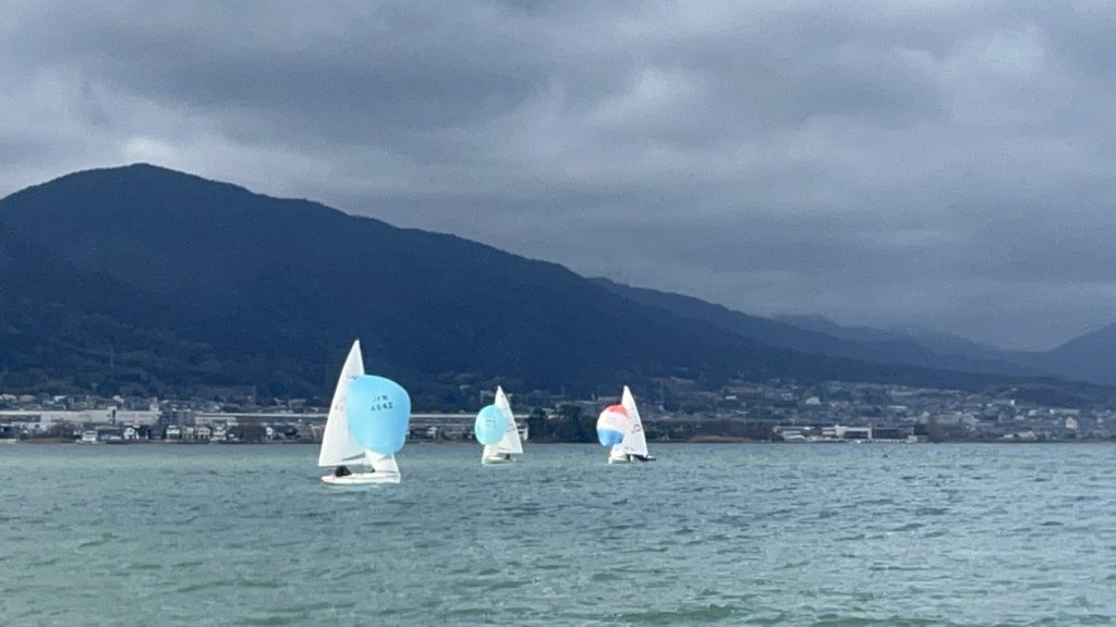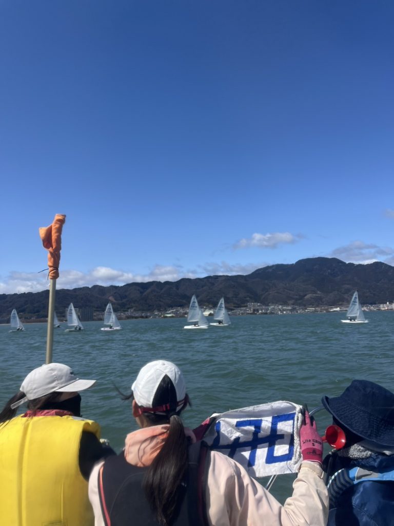 そして何より注目すべきは、3位に入賞した瀧口(3)大平(2)ペアでしょう。スキッパーの瀧口は2回生時点で、当時エーススキッパーだった東郷(5)と長くペアを組み、その厳しい指導に耐えながら、着実に実力を身につけてきました。今年度はエースクルーを務めながら、スキッパーとしても活動し、整備のために平日にも足繁く琵琶湖に通い、実力、態度ともに後輩から尊敬される先輩となりました。コメディカルレースでは、自艇の軽さをアドバンテージに、ダウンウィンドで西川(5)貴志(3)ペア、山田(4)氏原(2)ペアを抜き去り、3レース目では1下までダントツトップであり、来年度以降の活躍が非常に楽しみです。