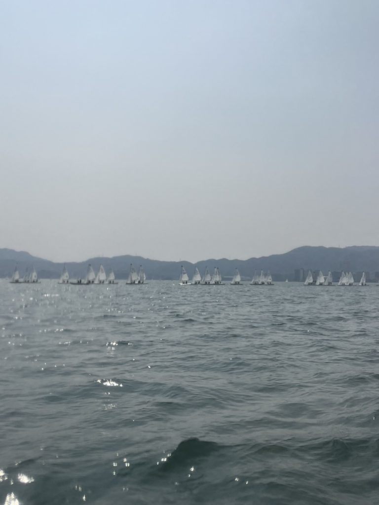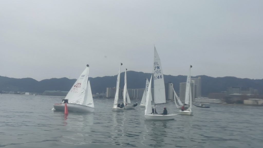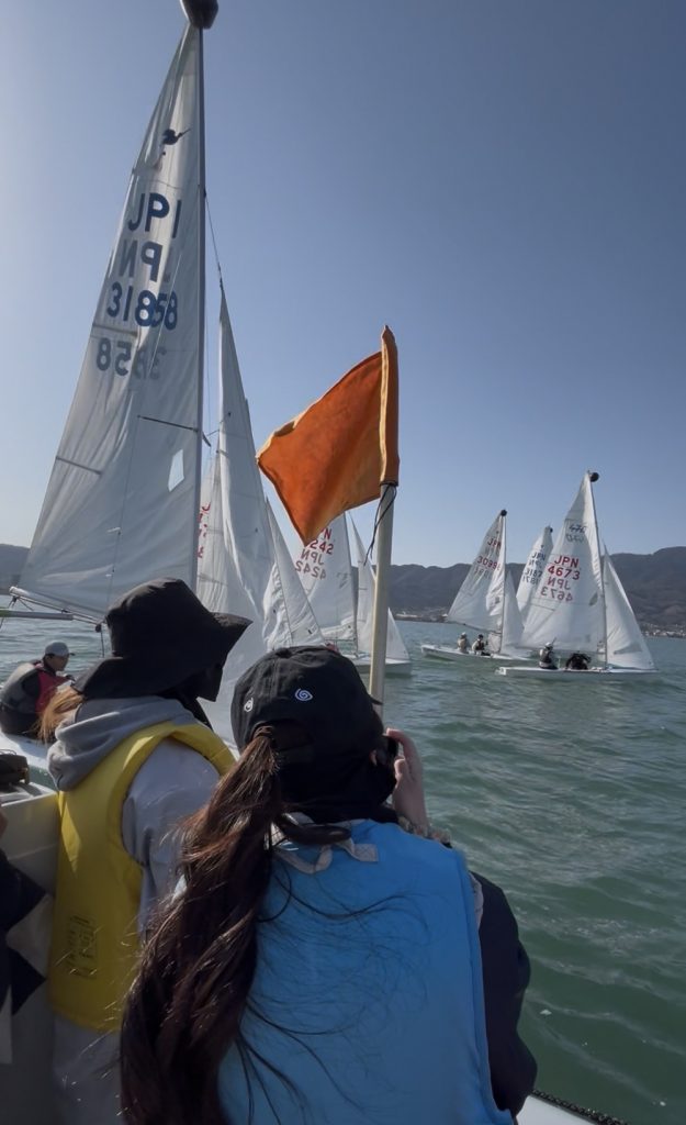 スナイプ級は1レース目から42条違反を取られるなど出鼻を挫かれる形となりましたが、この時点で優勝争いが予想される広島大学とは総合は同点であり42条違反の回数も同数であったため、次のレースまでの風待ちの間に反省をし、条件は同じだと上手く切り替えることができました。