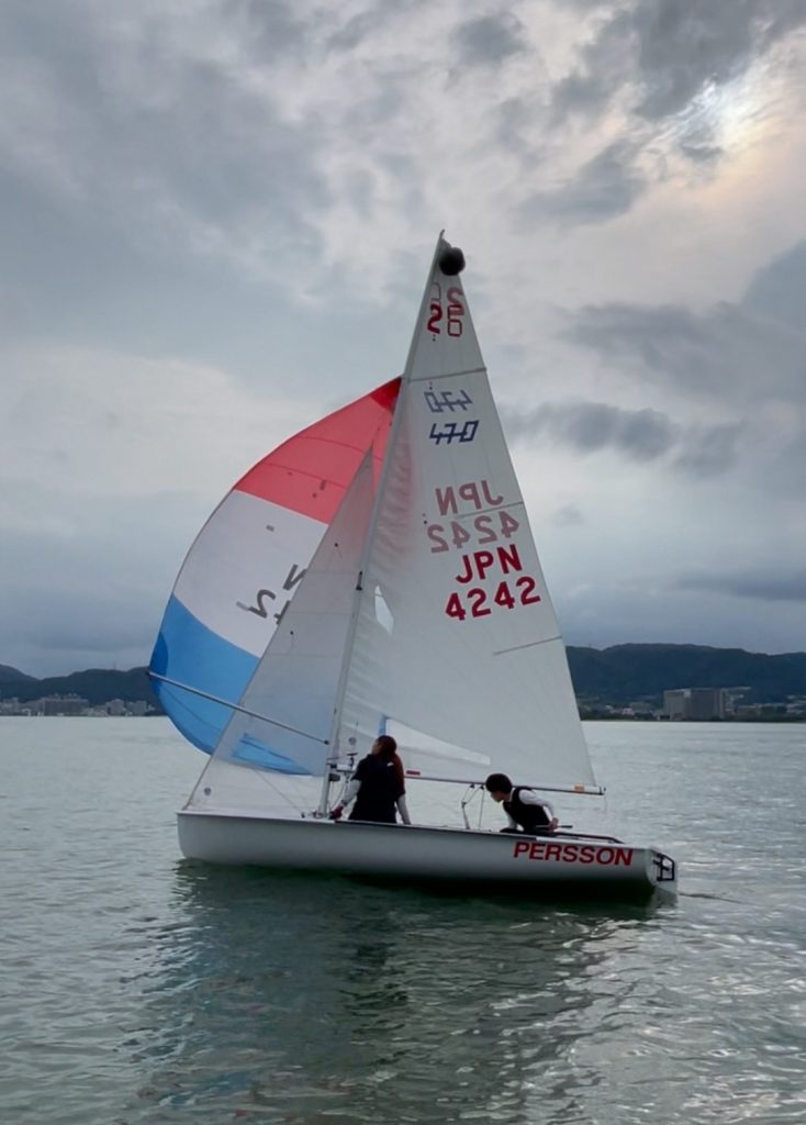 自分が1回生の頃はまだまだコロナが全盛期だった頃で、西医体が中止となり、ちょうどその時期に新歓が解禁され、「西医体がないなら、部員をとりあえず入れよう!」と熱心な勧誘を受けて入部しました。初めてハーバーに行った日は夏の風のない暑い日で、僕にトラピーズを経験させるために、クルーの先輩が下デッキで頑張ってトラピーズで伸びてくれていたのを覚えています。(風のない時の470の新歓あるあるですね。)